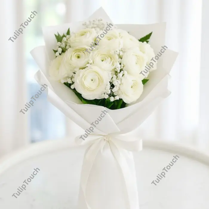 Ranunculus is a definite beauty, and adding the flower as a wonder on earth is worthwhile. Even though the pleated petals of the flower resemble roses, these flowers have a quirky look. Make your guests fall in love with these flowers for their enriched aesthetics. The paper-thin petals of the ranunculus flower give us the feel of artificial flowers, which are naturally made and artistic. Tulip touch brings 20 alluring white ranunculus flower stems and gypsophila to fill the magnificent bouquet. This ranunculus bouquet of ravishing flowers is all you need to make your event look royal. Send these flowers to someone you admire and make them feel special.